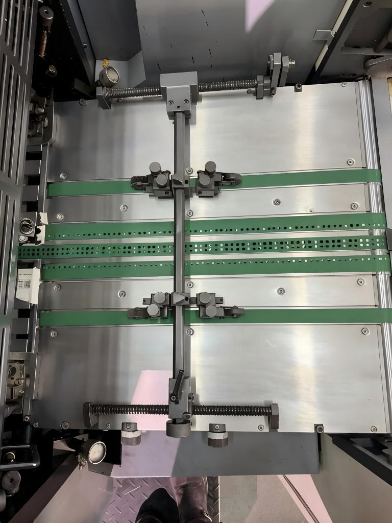 9) پریس میں ویکیوم سکشن پیپر فیڈنگ ٹیبل پر ایک مسلسل پیپر فیڈنگ سسٹم ہوتا ہے جس پر تین گھومنے والے کاغذ کی نقل و حمل کے بیلٹ نصب ہوتے ہیں۔ اس طرح کا کاغذی نقل و حمل کا نظام موٹائی کی وسیع رینج کے مختلف قسم کے کاغذات کو قابل اعتماد طریقے سے منتقل کر سکتا ہے۔